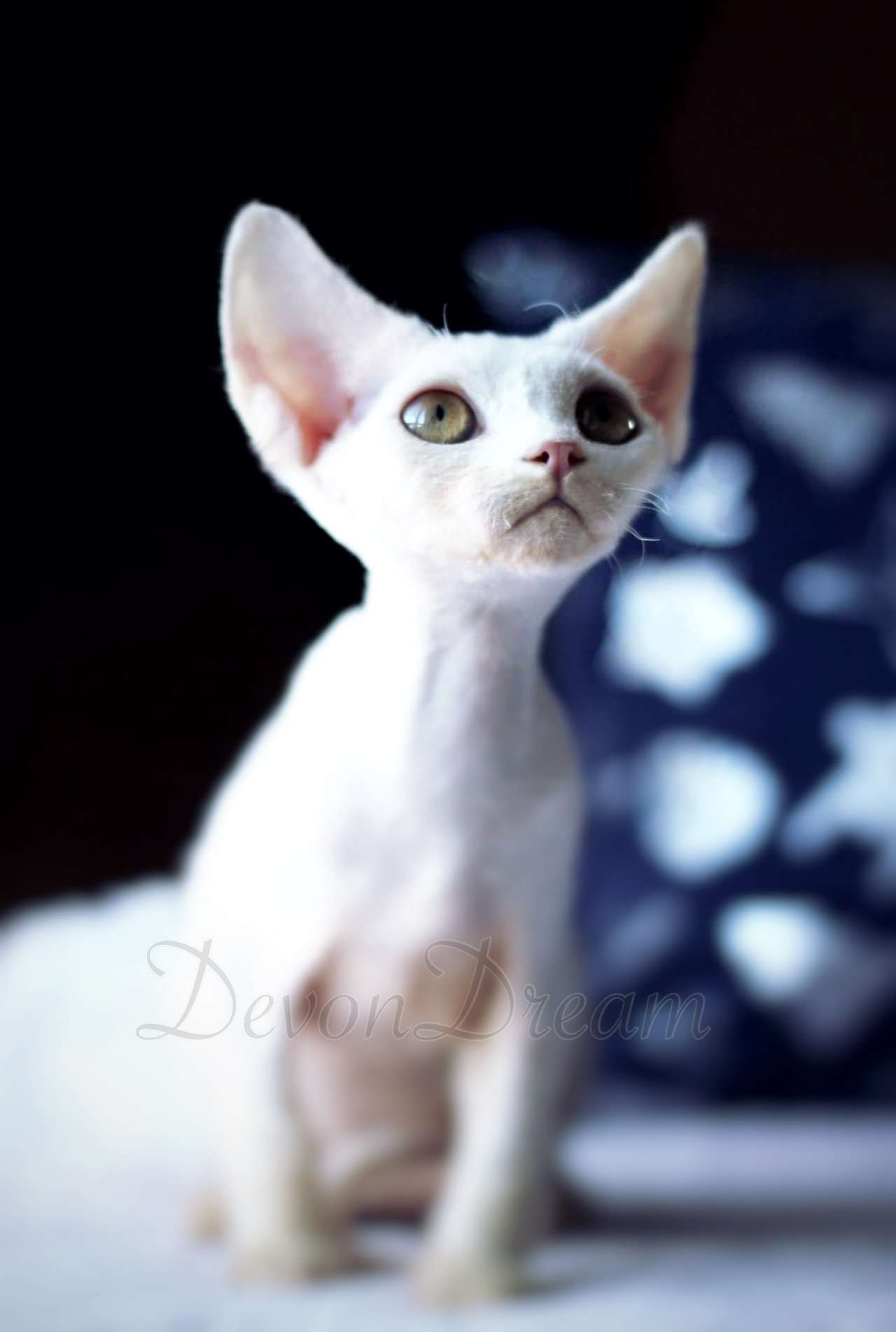 Biały słodziak o wielkich żółtych oczętach i ogromnych uszach
